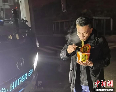 中新網(wǎng)南充1月22日電 (王爵 楊波)21日,是農(nóng)歷大年三十;楊洪,今年46歲,是廣東至四川南充線一名長途客運司機,是他安全完成春運任務的16個年頭,21日19時20分左右,楊洪順利到達重慶武隆服務區(qū)后,抓緊吃了碗泡面,外加了兩個鹵雞蛋,這就是楊洪今年的年夜飯。 據(jù)了解,楊洪每年的年夜飯都是泡面加兩個鹵蛋,今年他也不例外。楊洪說,按照現(xiàn)在的速度,估計22日凌晨1點前就可以把旅客安全送達南充,盡量讓旅客安全準時能回家過年。