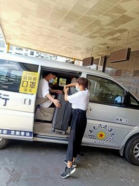 順慶分公司定制客運(yùn)班長(zhǎng)、駕駛員曾慧在抗疫轉(zhuǎn)運(yùn)離港人員中,為旅客幫提行李箱。