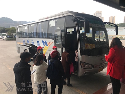 2020年2月20日中午13點(diǎn),南充汽車客運(yùn)站發(fā)班區(qū)內(nèi),在運(yùn)政人員和車站服務(wù)人員的揮手致意中,復(fù)班第一天的唯一一輛客車,載著10名旅客,駛離站臺,開往儀隴大寅。